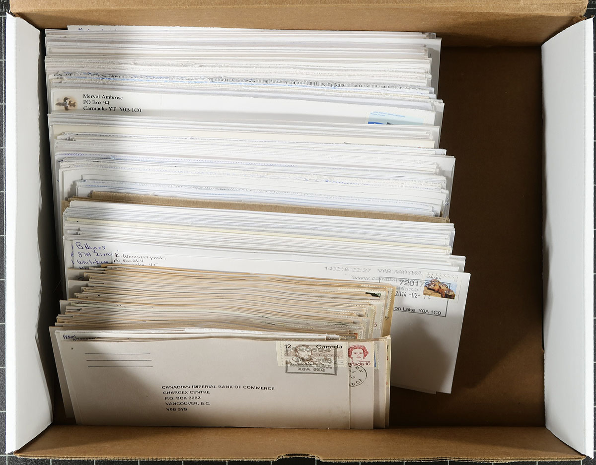 Northern Postal History. Accumulation of roughly 225 Yukon and Northwest Territories covers collected for town postmarks, 1970's-2010's. We note roughly 20 to 25 different towns (the majority from Yellowknife, Whitehorse, and Dawson), including Beaver Creek, Burwash Landing, Fort Simpson, Rankin Inlet, Ross River, Ft. Liard, Nanisivik, and more. Postmark interest includes cds, POCON, MOON, and Pictorial types, with most towns having different postmarks or frankings. A nice little lot for the postmark collector. Estimate =