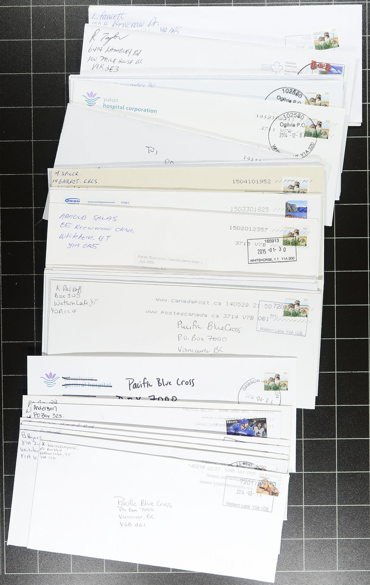 Northern Postal History. Accumulation of roughly 225 Yukon and Northwest Territories covers collected for town postmarks, 1970's-2010's. We note roughly 20 to 25 different towns (the majority from Yellowknife, Whitehorse, and Dawson), including Beaver Creek, Burwash Landing, Fort Simpson, Rankin Inlet, Ross River, Ft. Liard, Nanisivik, and more. Postmark interest includes cds, POCON, MOON, and Pictorial types, with most towns having different postmarks or frankings. A nice little lot for the postmark collector. Estimate =