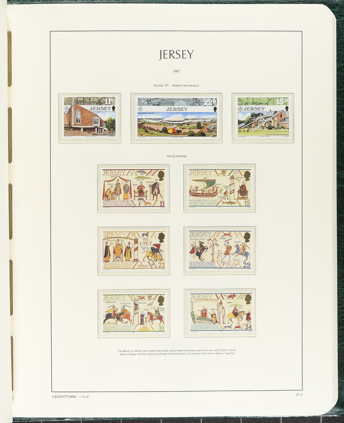 Lovely collection of primarily never hinged Jersey, 1941-2006, containing roughly 1,450 stamps in two Lighthouse albums with slipcases. The collection ranges from Scott #N1/1206, containing several sets, souvenir sheets, and a few postage dues. A spot check indicated some sets cataloguing $5 to $15 each, with a 2026 Scott catalogue value for the collection totaling US$1,755.00 ($2,369.25 CDN). A lovely collection that should be continued, very fine. Estimate =