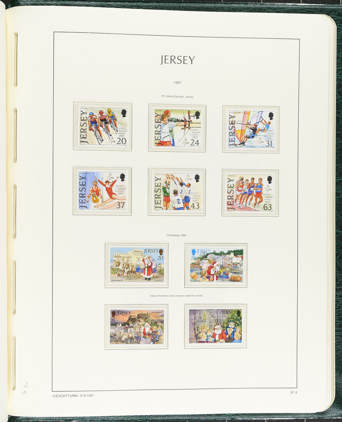 Lovely collection of primarily never hinged Jersey, 1941-2006, containing roughly 1,450 stamps in two Lighthouse albums with slipcases. The collection ranges from Scott #N1/1206, containing several sets, souvenir sheets, and a few postage dues. A spot check indicated some sets cataloguing $5 to $15 each, with a 2026 Scott catalogue value for the collection totaling US$1,755.00 ($2,369.25 CDN). A lovely collection that should be continued, very fine. Estimate =