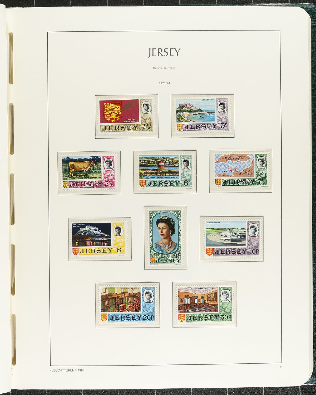 Lovely collection of primarily never hinged Jersey, 1941-2006, containing roughly 1,450 stamps in two Lighthouse albums with slipcases. The collection ranges from Scott #N1/1206, containing several sets, souvenir sheets, and a few postage dues. A spot check indicated some sets cataloguing $5 to $15 each, with a 2026 Scott catalogue value for the collection totaling US$1,755.00 ($2,369.25 CDN). A lovely collection that should be continued, very fine. Estimate =