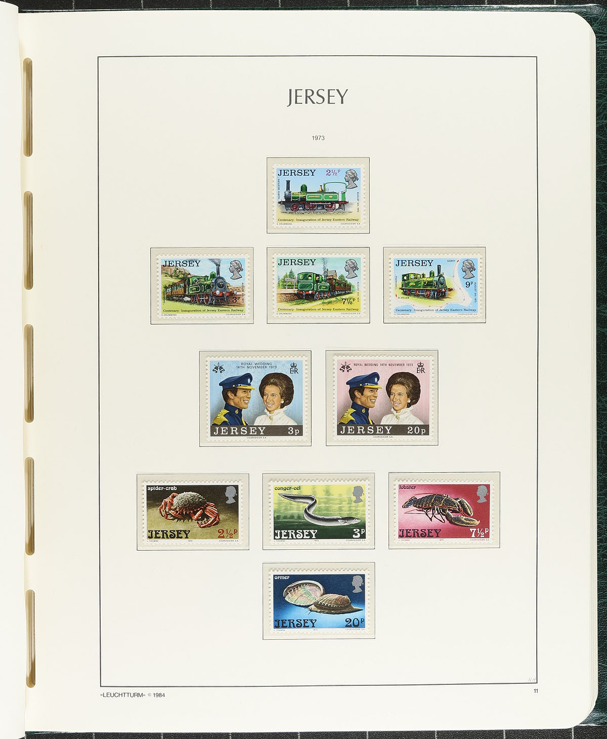 Lovely collection of primarily never hinged Jersey, 1941-2006, containing roughly 1,450 stamps in two Lighthouse albums with slipcases. The collection ranges from Scott #N1/1206, containing several sets, souvenir sheets, and a few postage dues. A spot check indicated some sets cataloguing $5 to $15 each, with a 2026 Scott catalogue value for the collection totaling US$1,755.00 ($2,369.25 CDN). A lovely collection that should be continued, very fine. Estimate =
