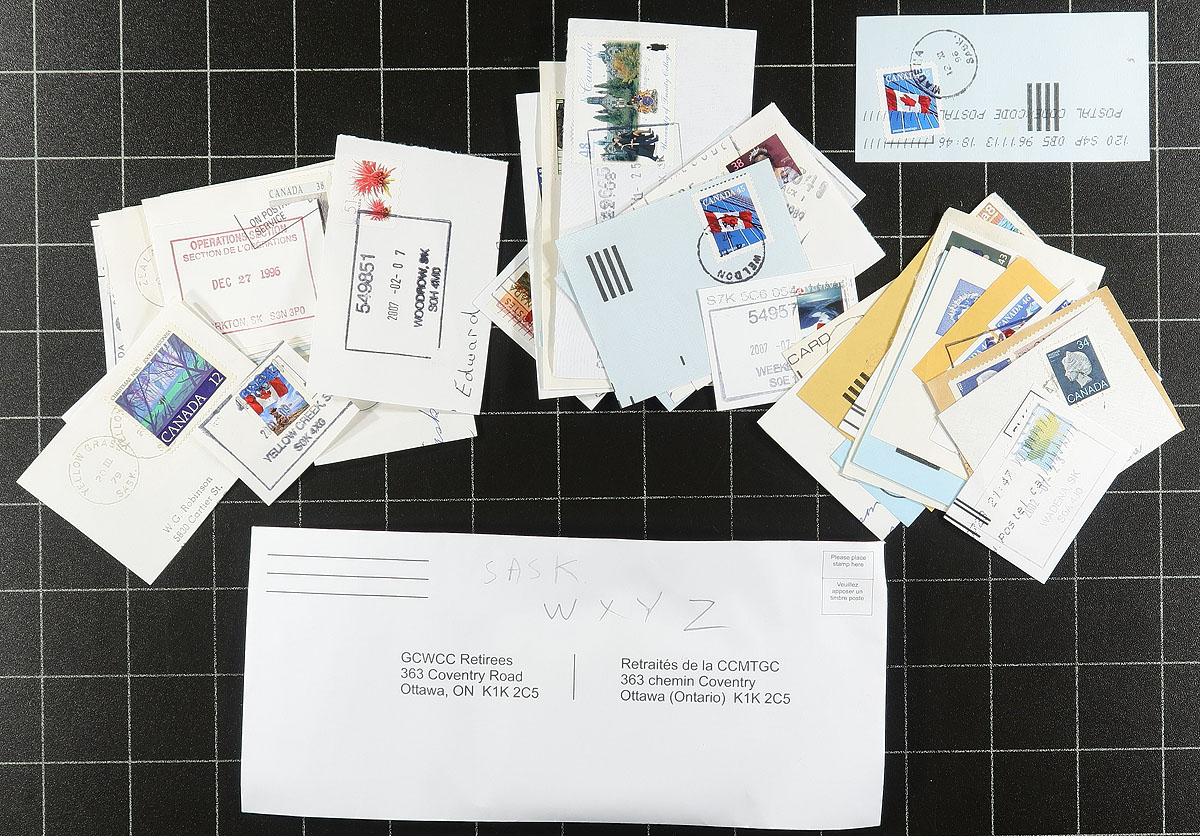 Nice collection of roughly 800 pieces collected for Saskatchewan town postmarks, 1940's-2000's, all appearing to be stamps on piece, neatly organized alphabetically in several envelopes. A spot check indicated several hundred towns ranging from A to Z, noting a variety of postmark types including cds, split ring, MOON, POCON, Klussendorf, and a few more. Just a few of the towns include Sandy Bay, Spy Hill, Paddockwood, Arran, Birch Hills, Canoe Narrows, Debden, and much more. A nice lot for the postmark hunter. Estimate =