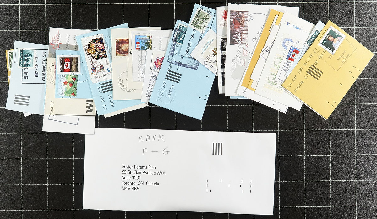 Nice collection of roughly 800 pieces collected for Saskatchewan town postmarks, 1940's-2000's, all appearing to be stamps on piece, neatly organized alphabetically in several envelopes. A spot check indicated several hundred towns ranging from A to Z, noting a variety of postmark types including cds, split ring, MOON, POCON, Klussendorf, and a few more. Just a few of the towns include Sandy Bay, Spy Hill, Paddockwood, Arran, Birch Hills, Canoe Narrows, Debden, and much more. A nice lot for the postmark hunter. Estimate =