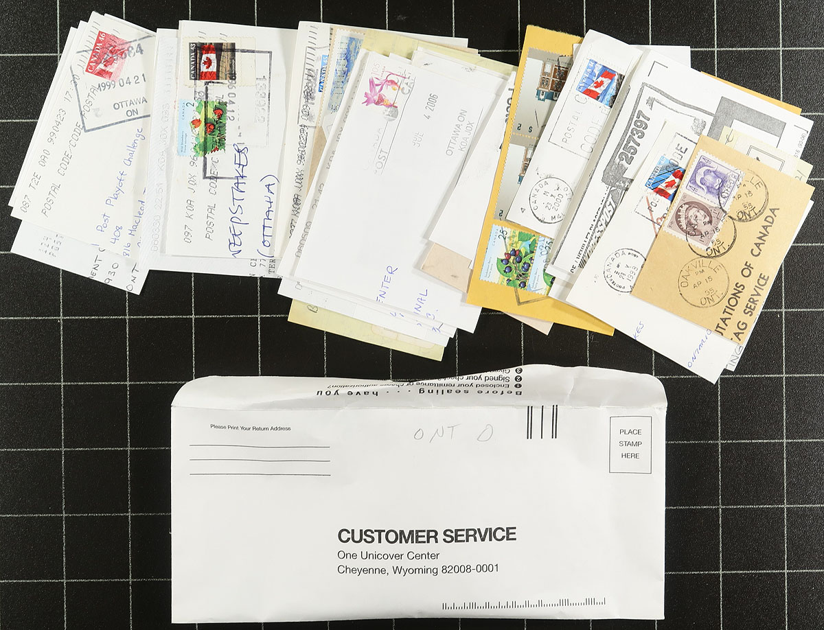 Nice collection of roughly 1,200 pieces collected for Saskatchewan town postmarks, 1940's-2000's, all appearing to be stamps on piece, neatly organized alphabetically in several envelopes. A spot check indicated several hundred towns ranging from A to Z, noting a variety of postmark types including cds, split ring, MOON, POCON, Klussendorf, and a few more. Just a few of the towns include Waterdown, Palgrave, Red Lake, Ramore, Armstrong, Lucan, South Porcupine, and much more. A nice lot for the postmark collector. Estimate =