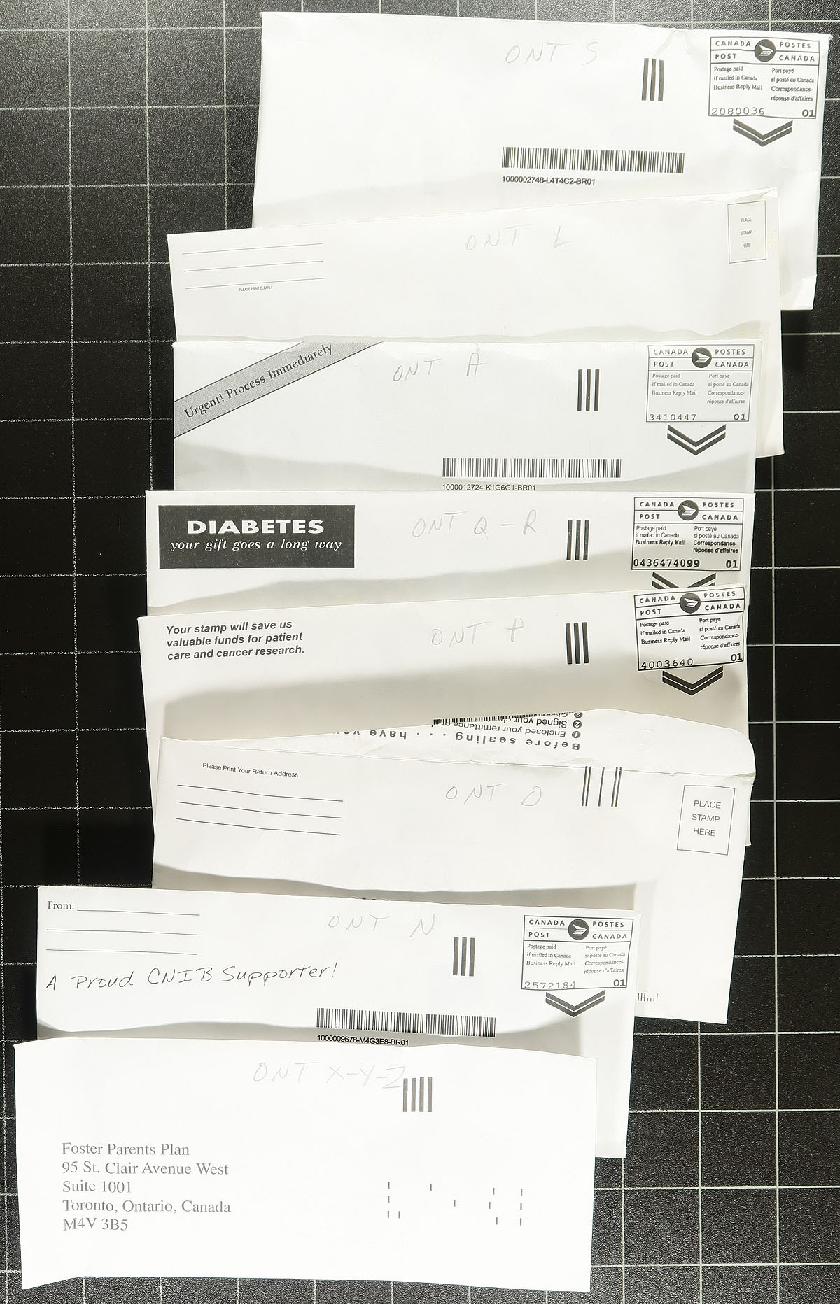 Nice collection of roughly 1,200 pieces collected for Saskatchewan town postmarks, 1940's-2000's, all appearing to be stamps on piece, neatly organized alphabetically in several envelopes. A spot check indicated several hundred towns ranging from A to Z, noting a variety of postmark types including cds, split ring, MOON, POCON, Klussendorf, and a few more. Just a few of the towns include Waterdown, Palgrave, Red Lake, Ramore, Armstrong, Lucan, South Porcupine, and much more. A nice lot for the postmark collector. Estimate =