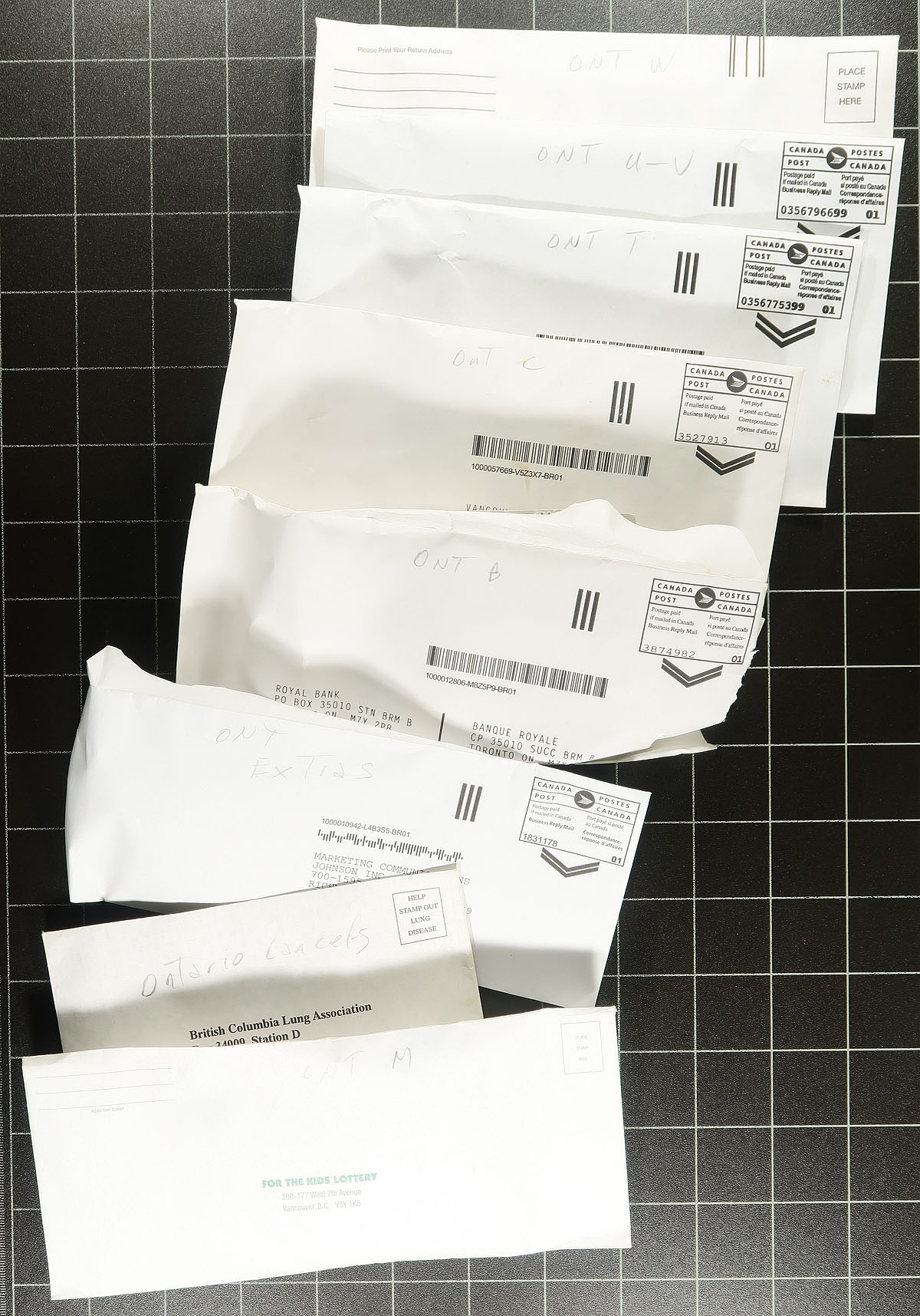 Nice collection of roughly 1,200 pieces collected for Saskatchewan town postmarks, 1940's-2000's, all appearing to be stamps on piece, neatly organized alphabetically in several envelopes. A spot check indicated several hundred towns ranging from A to Z, noting a variety of postmark types including cds, split ring, MOON, POCON, Klussendorf, and a few more. Just a few of the towns include Waterdown, Palgrave, Red Lake, Ramore, Armstrong, Lucan, South Porcupine, and much more. A nice lot for the postmark collector. Estimate =
