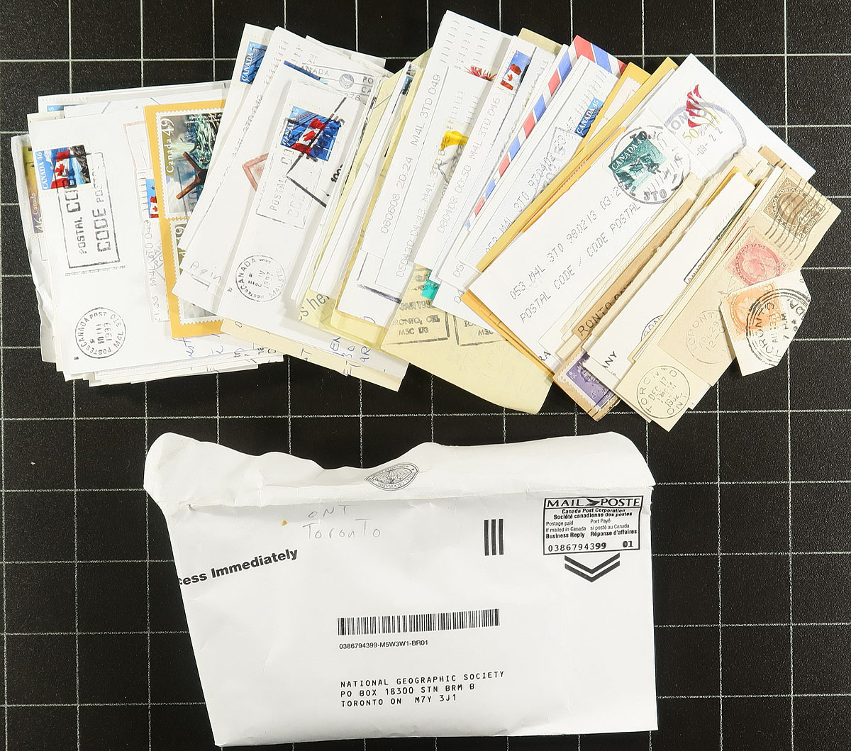 Nice collection of roughly 1,200 pieces collected for Saskatchewan town postmarks, 1940's-2000's, all appearing to be stamps on piece, neatly organized alphabetically in several envelopes. A spot check indicated several hundred towns ranging from A to Z, noting a variety of postmark types including cds, split ring, MOON, POCON, Klussendorf, and a few more. Just a few of the towns include Waterdown, Palgrave, Red Lake, Ramore, Armstrong, Lucan, South Porcupine, and much more. A nice lot for the postmark collector. Estimate =