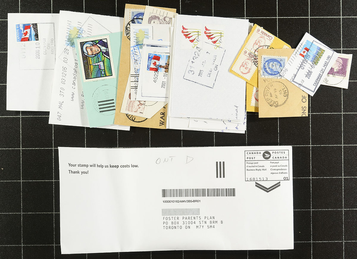Nice collection of roughly 1,200 pieces collected for Saskatchewan town postmarks, 1940's-2000's, all appearing to be stamps on piece, neatly organized alphabetically in several envelopes. A spot check indicated several hundred towns ranging from A to Z, noting a variety of postmark types including cds, split ring, MOON, POCON, Klussendorf, and a few more. Just a few of the towns include Waterdown, Palgrave, Red Lake, Ramore, Armstrong, Lucan, South Porcupine, and much more. A nice lot for the postmark collector. Estimate =