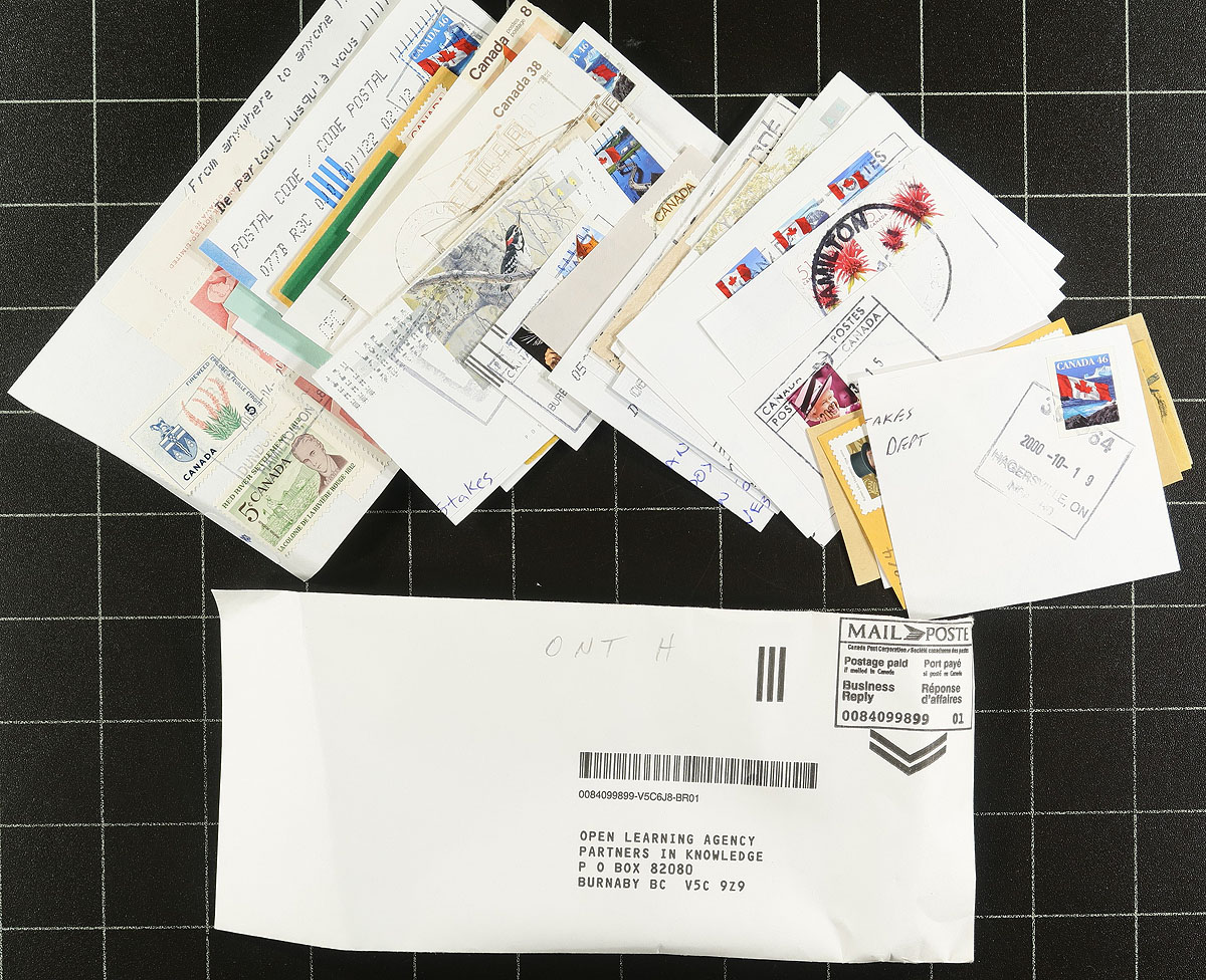 Nice collection of roughly 1,200 pieces collected for Saskatchewan town postmarks, 1940's-2000's, all appearing to be stamps on piece, neatly organized alphabetically in several envelopes. A spot check indicated several hundred towns ranging from A to Z, noting a variety of postmark types including cds, split ring, MOON, POCON, Klussendorf, and a few more. Just a few of the towns include Waterdown, Palgrave, Red Lake, Ramore, Armstrong, Lucan, South Porcupine, and much more. A nice lot for the postmark collector. Estimate =