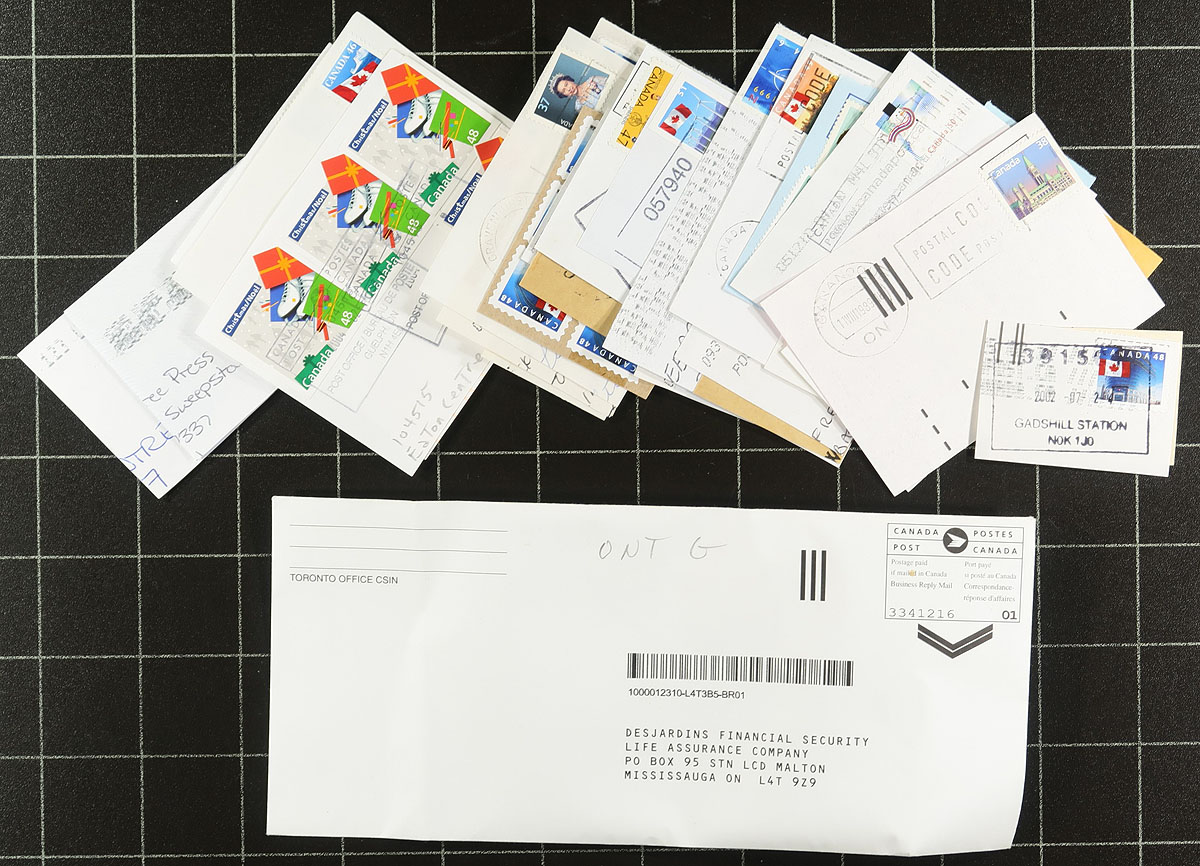 Nice collection of roughly 1,200 pieces collected for Saskatchewan town postmarks, 1940's-2000's, all appearing to be stamps on piece, neatly organized alphabetically in several envelopes. A spot check indicated several hundred towns ranging from A to Z, noting a variety of postmark types including cds, split ring, MOON, POCON, Klussendorf, and a few more. Just a few of the towns include Waterdown, Palgrave, Red Lake, Ramore, Armstrong, Lucan, South Porcupine, and much more. A nice lot for the postmark collector. Estimate =