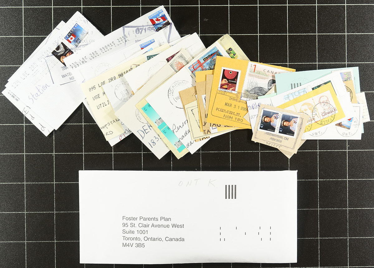 Nice collection of roughly 1,200 pieces collected for Saskatchewan town postmarks, 1940's-2000's, all appearing to be stamps on piece, neatly organized alphabetically in several envelopes. A spot check indicated several hundred towns ranging from A to Z, noting a variety of postmark types including cds, split ring, MOON, POCON, Klussendorf, and a few more. Just a few of the towns include Waterdown, Palgrave, Red Lake, Ramore, Armstrong, Lucan, South Porcupine, and much more. A nice lot for the postmark collector. Estimate =