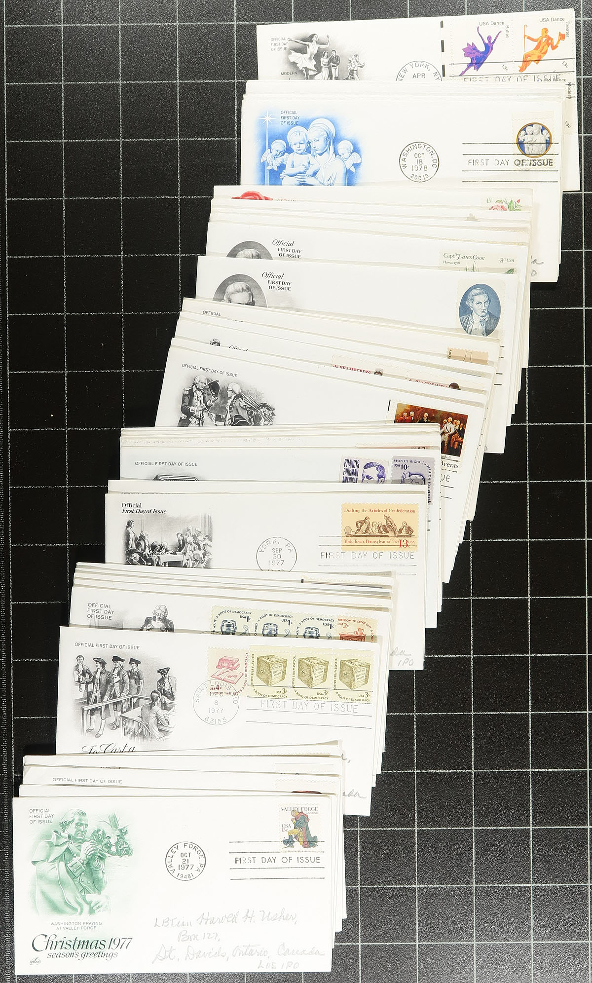 Nice group of roughly 450 first day covers, 1960's-1980's, noting singles, pairs, and blocks frankings, many having colourful cachets by Fleetwood, and a few other makers. A nice clean lot for collectors and dealers alike. Estimate =