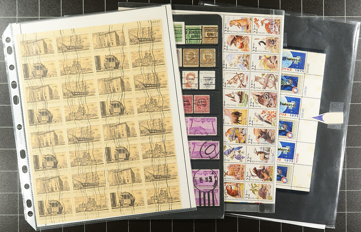 Accumulation of mint and used United States, 1900's-1990's, containing a few thousand stamps in a variety of formats including several album or stock pages, annual and thematic collections, glassines, etc. A spot check indicated mint and or used singles, sets, blocks, multiples, precancels, and more, including annual collections from 1994-1995, and 1997, noting some material cataloguing $5 to $10 each. Face value alone is estimated to be in the $150 range. A nice starter group for the United States collector, overall fine to very fine. Estimate =