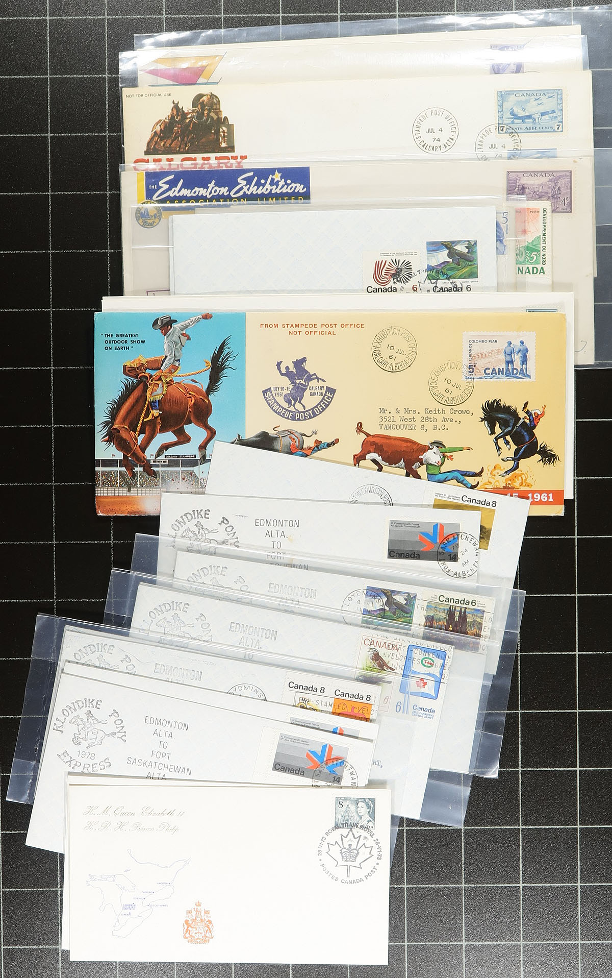 Nice group of roughly 250 Exhibition and Commemorative covers, 1950's-1990's, containing a nice array of local, national, and international covers from stamp exhibitions, event covers (many from the Calgary Stampede), Royall Train covers, and more. The lot also includes roughly 20 additional covers with international stamp frankings from various international stamp exhibitions. A nice lot for the show and cover collector. Estimate =