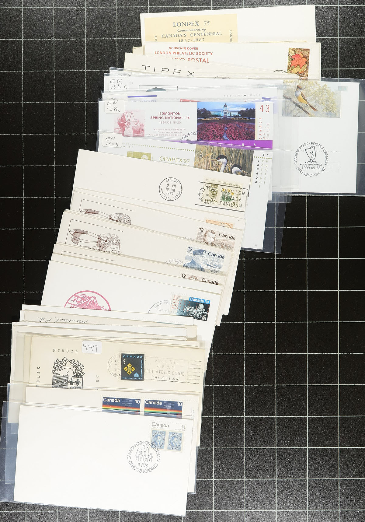 Nice group of roughly 250 Exhibition and Commemorative covers, 1950's-1990's, containing a nice array of local, national, and international covers from stamp exhibitions, event covers (many from the Calgary Stampede), Royall Train covers, and more. The lot also includes roughly 20 additional covers with international stamp frankings from various international stamp exhibitions. A nice lot for the show and cover collector. Estimate =