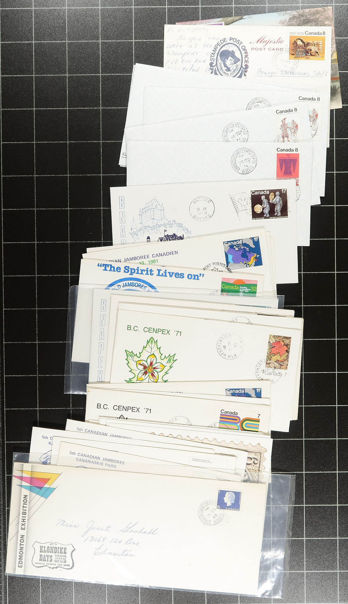 Nice group of roughly 250 Exhibition and Commemorative covers, 1950's-1990's, containing a nice array of local, national, and international covers from stamp exhibitions, event covers (many from the Calgary Stampede), Royall Train covers, and more. The lot also includes roughly 20 additional covers with international stamp frankings from various international stamp exhibitions. A nice lot for the show and cover collector. Estimate =