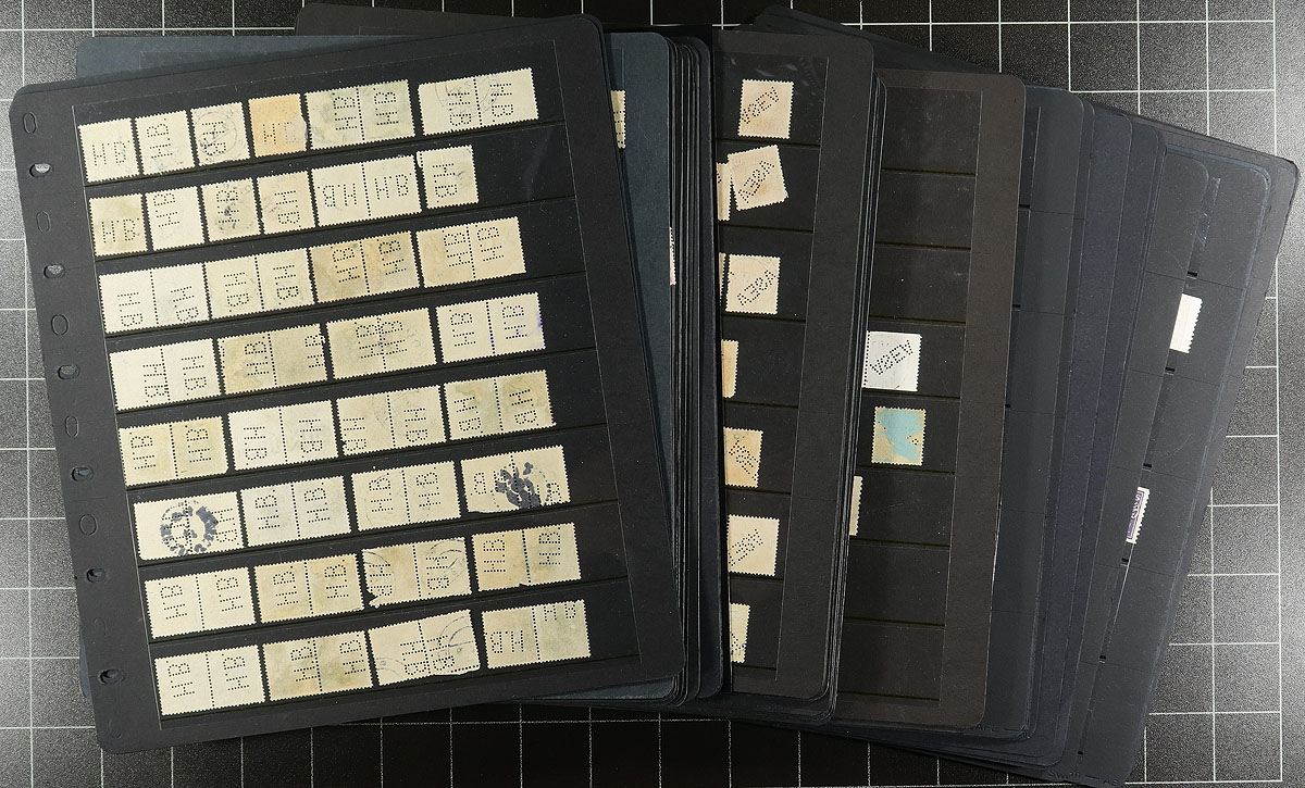 Accumulation of many hundreds of Sweden private perfins, all in roughly 40 stock pages. Many of the perfins have been identified noting several different patterns and stamps. It appears there is heavy duplication for some patterns, still a nice lot for the specialist. Overall fine to very fine. Estimate =