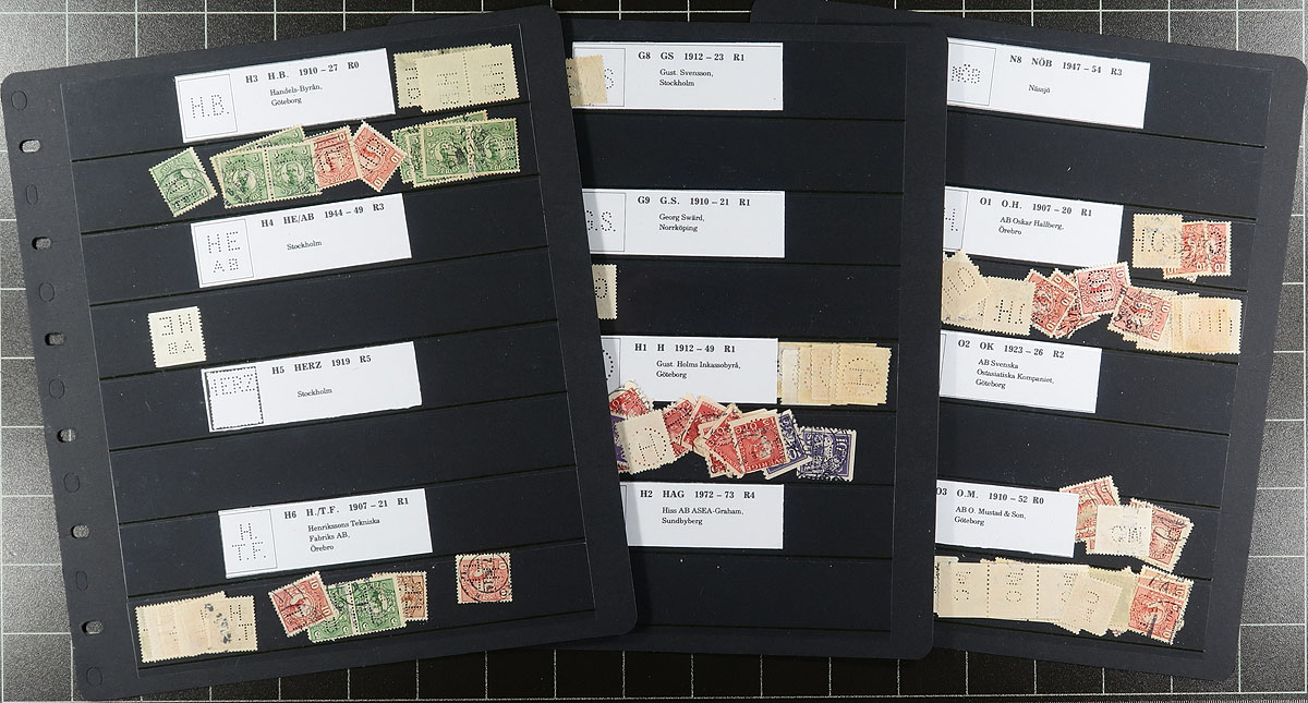 Accumulation of many hundreds of Sweden private perfins, all in roughly 40 stock pages. Many of the perfins have been identified noting several different patterns and stamps. It appears there is heavy duplication for some patterns, still a nice lot for the specialist. Overall fine to very fine. Estimate =