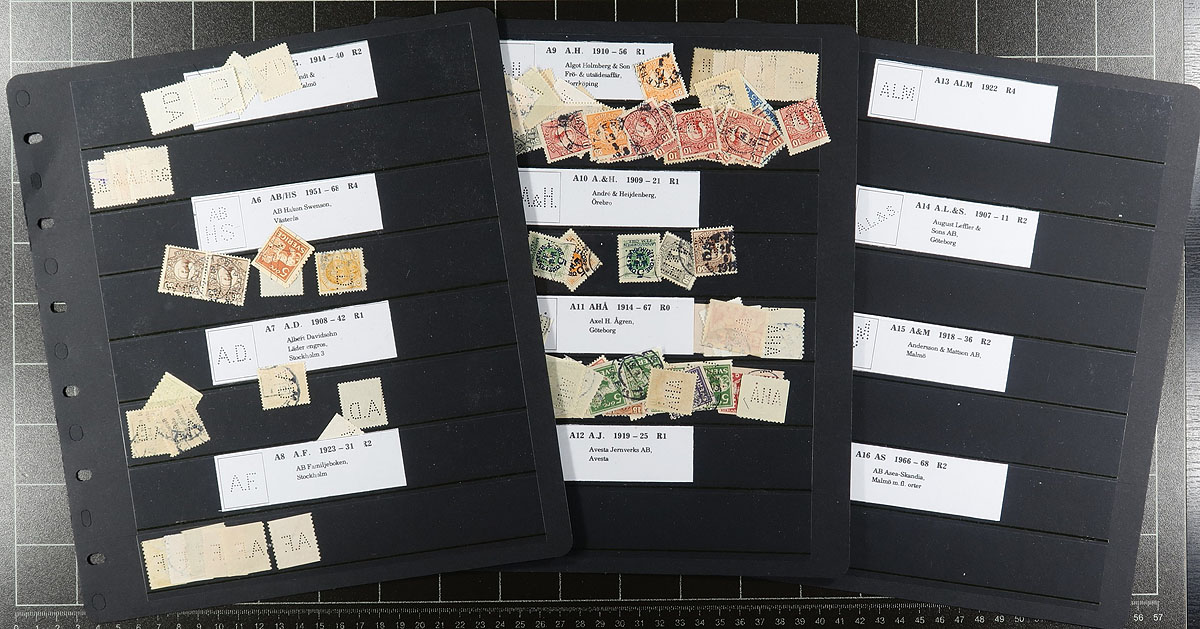 Accumulation of many hundreds of Sweden private perfins, all in roughly 40 stock pages. Many of the perfins have been identified noting several different patterns and stamps. It appears there is heavy duplication for some patterns, still a nice lot for the specialist. Overall fine to very fine. Estimate =