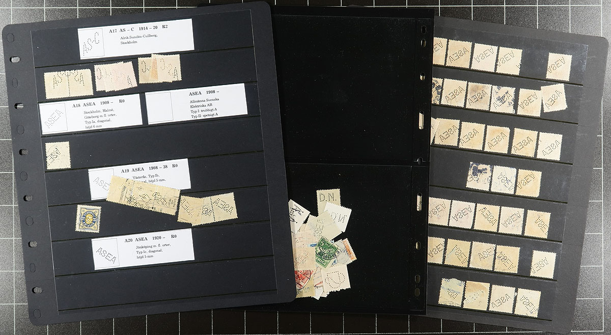Accumulation of many hundreds of Sweden private perfins, all in roughly 40 stock pages. Many of the perfins have been identified noting several different patterns and stamps. It appears there is heavy duplication for some patterns, still a nice lot for the specialist. Overall fine to very fine. Estimate =