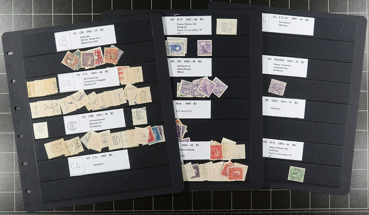 Accumulation of many hundreds of Sweden private perfins, all in roughly 40 stock pages. Many of the perfins have been identified noting several different patterns and stamps. It appears there is heavy duplication for some patterns, still a nice lot for the specialist. Overall fine to very fine. Estimate =