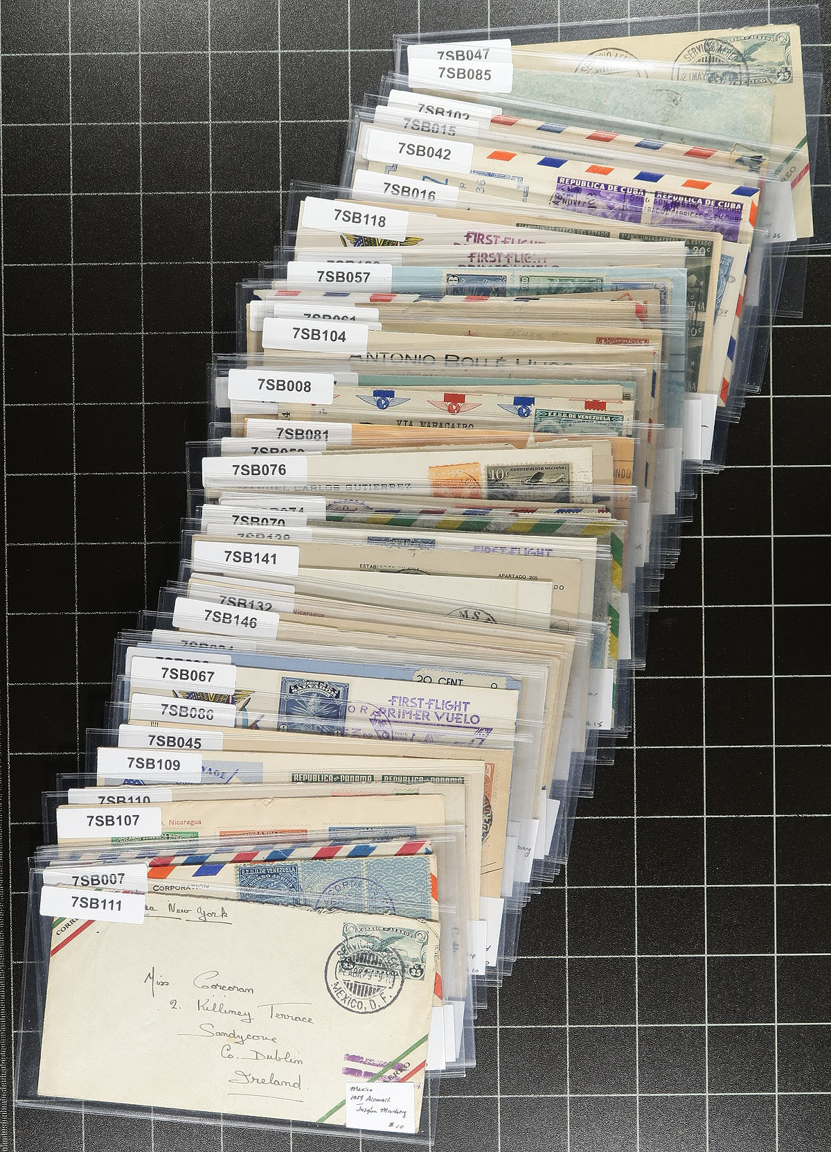 Central and South America Covers. Better group of 56 covers and cards, 1910's-1930's, with a few on either side of the given range, noting representation from Panama, Venezuela, Mexico, Cuba, Peru, Honduras, Chile, along with other regions. We note many airmail covers, some censored mail, first flights, first day covers, and an 1860 stampless folded letter from Cuba, and much more. All the covers are sleeved and priced, with the majority in the $10.00-$15.00 range. Total retail as marked =