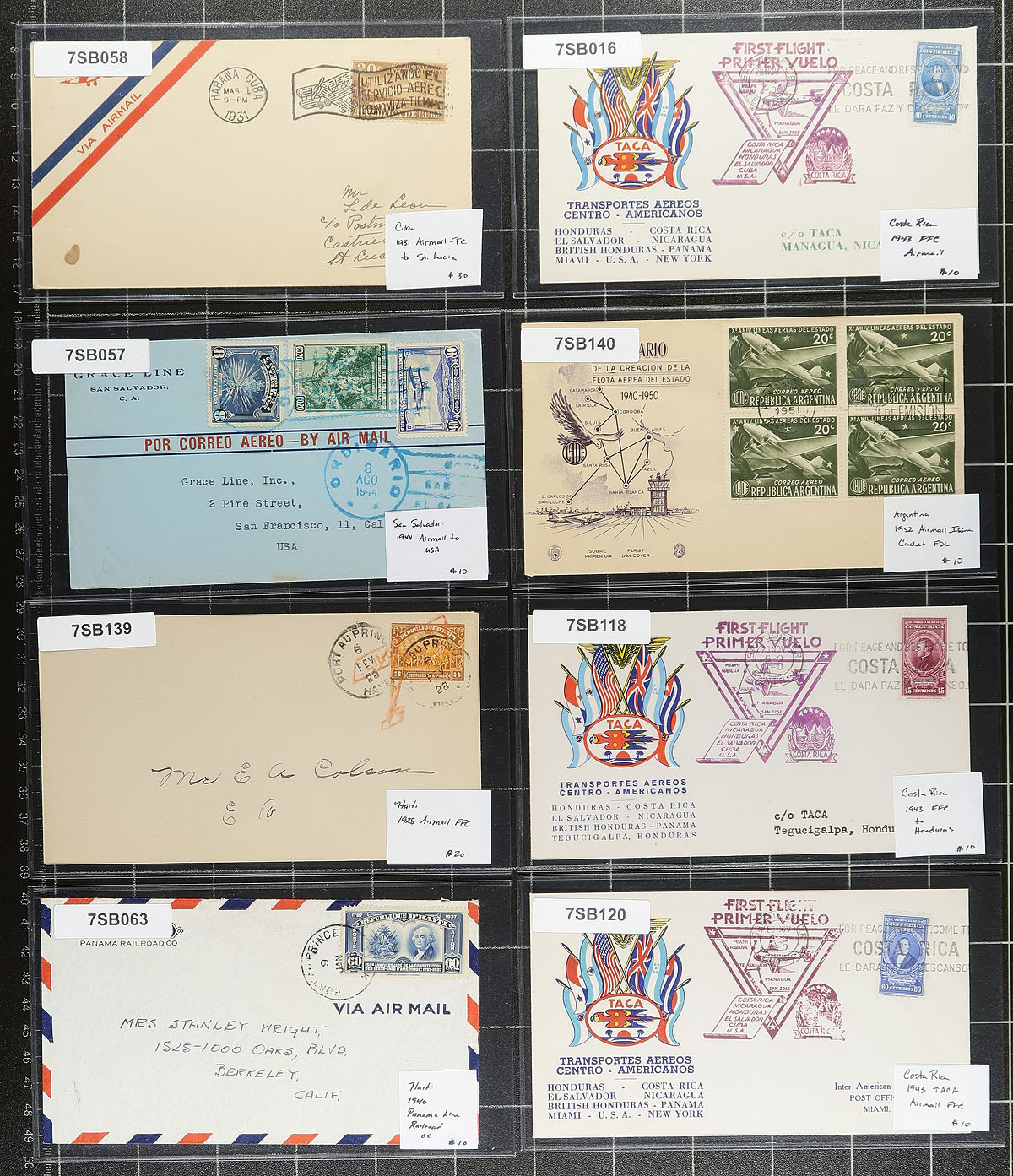 Central and South America Covers. Better group of 56 covers and cards, 1910's-1930's, with a few on either side of the given range, noting representation from Panama, Venezuela, Mexico, Cuba, Peru, Honduras, Chile, along with other regions. We note many airmail covers, some censored mail, first flights, first day covers, and an 1860 stampless folded letter from Cuba, and much more. All the covers are sleeved and priced, with the majority in the $10.00-$15.00 range. Total retail as marked =