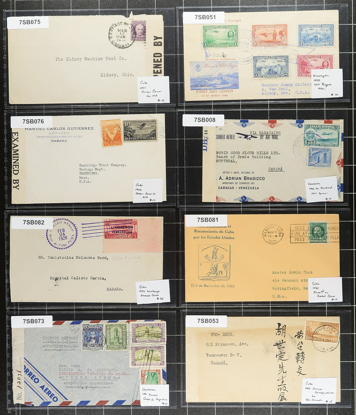 Central and South America Covers. Better group of 56 covers and cards, 1910's-1930's, with a few on either side of the given range, noting representation from Panama, Venezuela, Mexico, Cuba, Peru, Honduras, Chile, along with other regions. We note many airmail covers, some censored mail, first flights, first day covers, and an 1860 stampless folded letter from Cuba, and much more. All the covers are sleeved and priced, with the majority in the $10.00-$15.00 range. Total retail as marked =