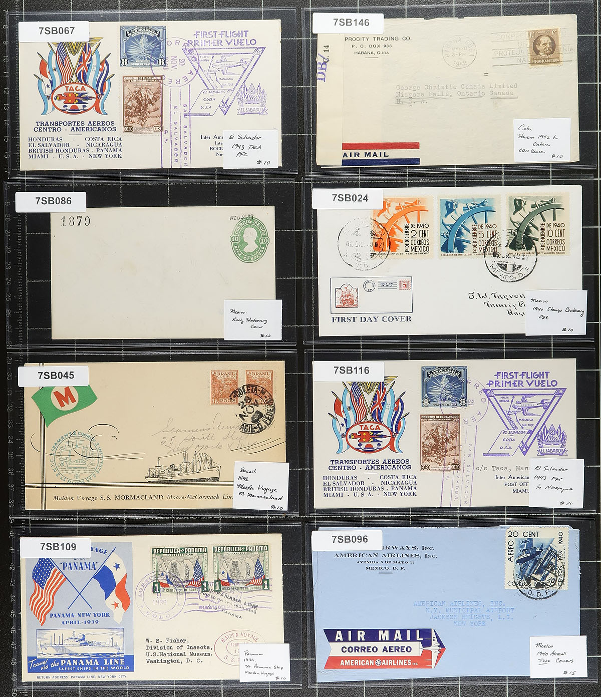 Central and South America Covers. Better group of 56 covers and cards, 1910's-1930's, with a few on either side of the given range, noting representation from Panama, Venezuela, Mexico, Cuba, Peru, Honduras, Chile, along with other regions. We note many airmail covers, some censored mail, first flights, first day covers, and an 1860 stampless folded letter from Cuba, and much more. All the covers are sleeved and priced, with the majority in the $10.00-$15.00 range. Total retail as marked =