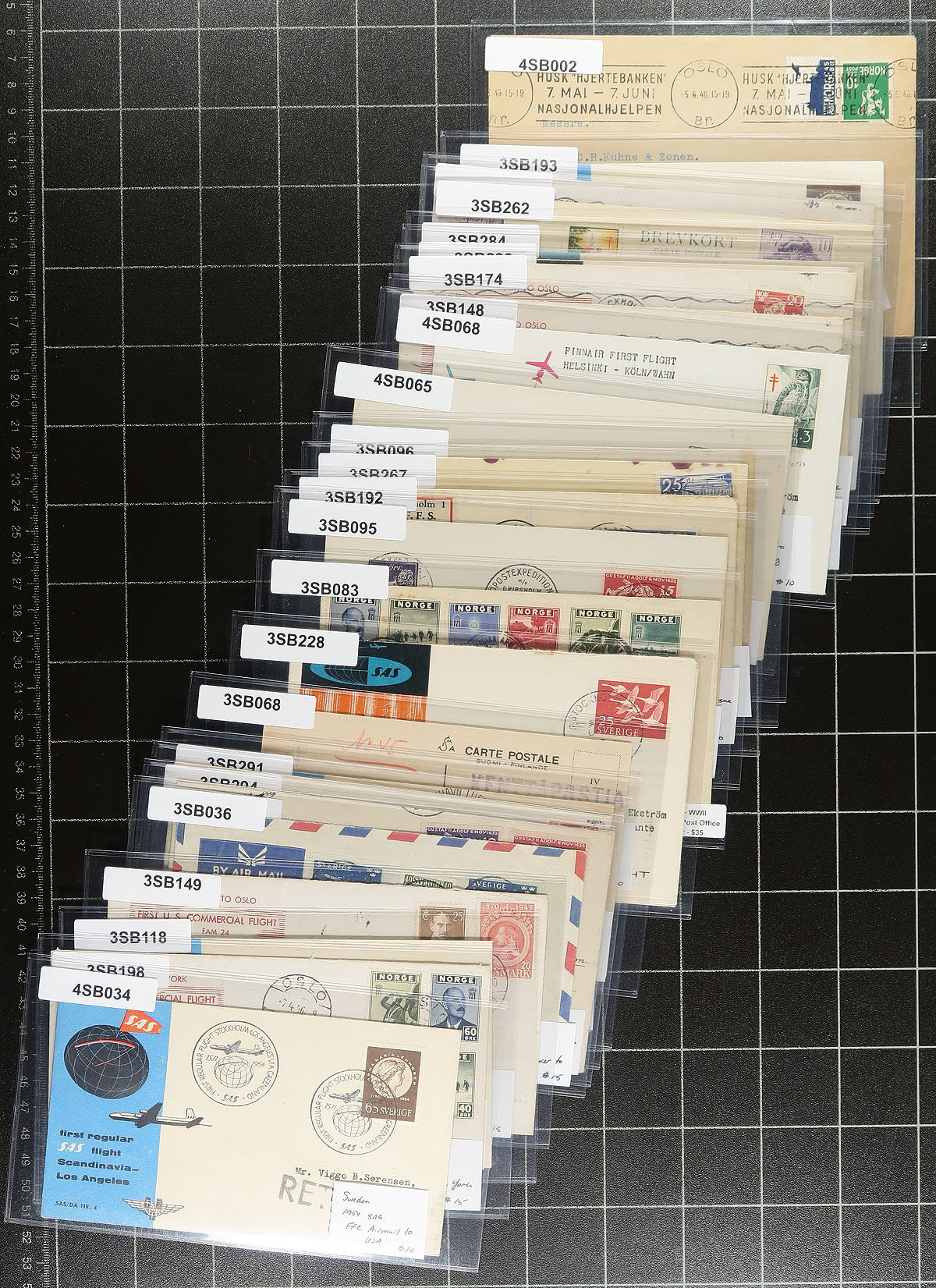 Scandinavia Covers. Better group of 29 covers and cards, 1930's-1960's, containing a wide variety of material from Sweden, Finland, Greenland, Norway, and Denmark. We spotted first flights, Sweden Sea Post cover, paquebot covers, censor mail and more. All the covers are sleeved and priced, most ranging from $10 to $20 each. A nice lot for collectors and a nice prepared lot for dealers and online sellers. Total retail as marked =