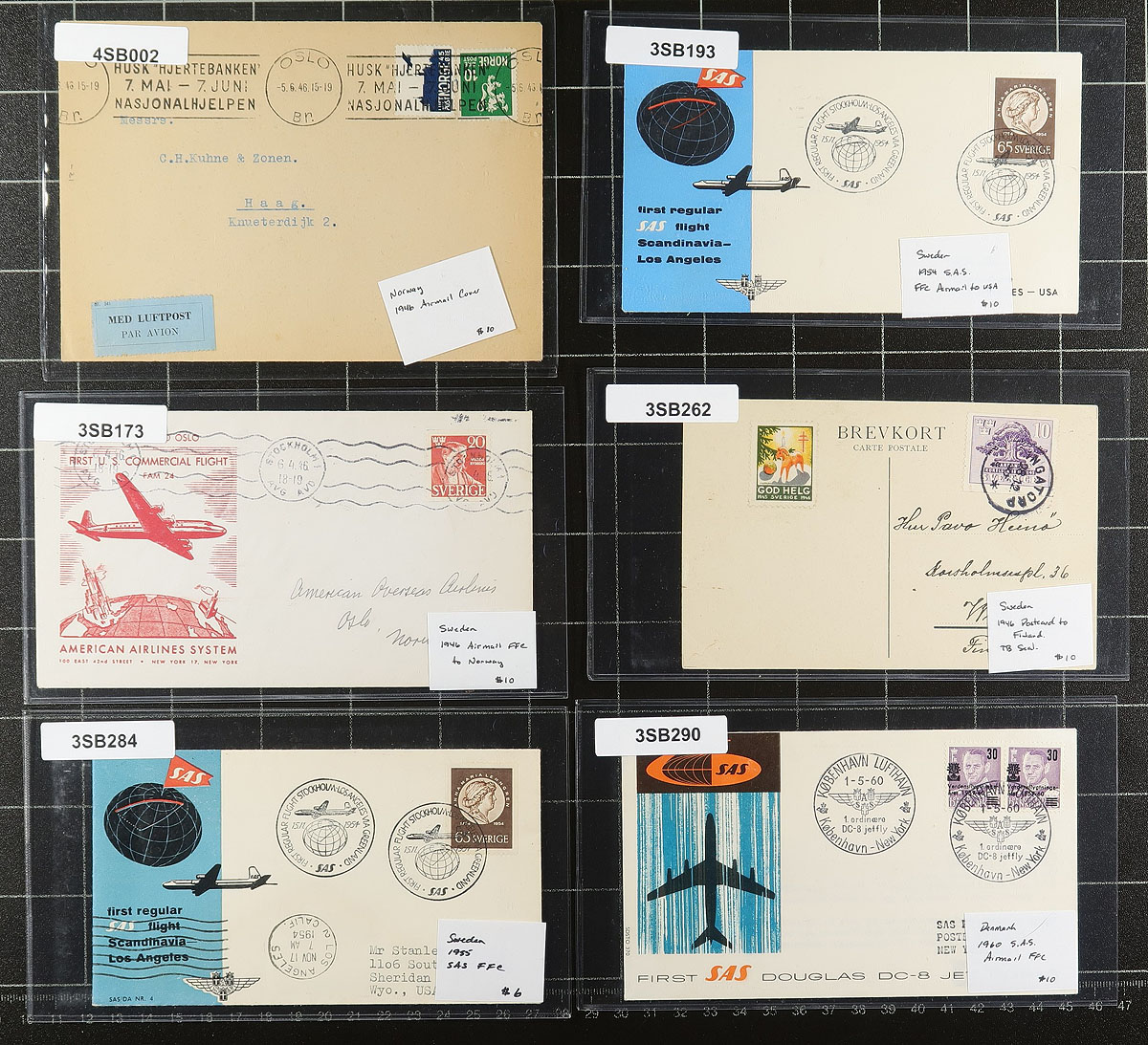 Scandinavia Covers. Better group of 29 covers and cards, 1930's-1960's, containing a wide variety of material from Sweden, Finland, Greenland, Norway, and Denmark. We spotted first flights, Sweden Sea Post cover, paquebot covers, censor mail and more. All the covers are sleeved and priced, most ranging from $10 to $20 each. A nice lot for collectors and a nice prepared lot for dealers and online sellers. Total retail as marked =