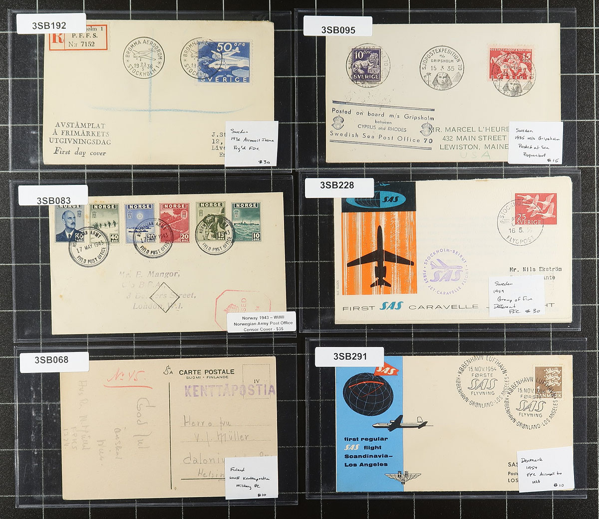 Scandinavia Covers. Better group of 29 covers and cards, 1930's-1960's, containing a wide variety of material from Sweden, Finland, Greenland, Norway, and Denmark. We spotted first flights, Sweden Sea Post cover, paquebot covers, censor mail and more. All the covers are sleeved and priced, most ranging from $10 to $20 each. A nice lot for collectors and a nice prepared lot for dealers and online sellers. Total retail as marked =
