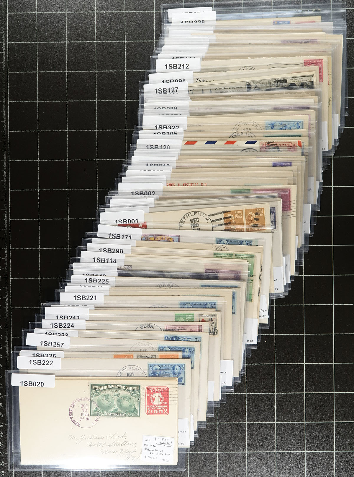 Lovely group of 54 United States covers and cards, 1910's-1940's, containing first day covers, special events, and illustrated advertising covers. We note many many colourful cachets for most covers, along with a few having labels, with every cover sleeved and having retail pricing, most ranging from $10 to $20 each (total retail as marked is $792.00). A lovely lot for collectors and a ready made lot for dealers and online sellers. Estimate =