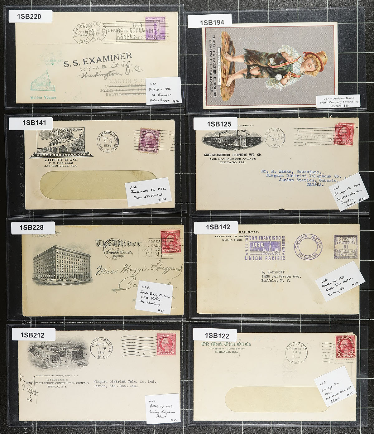 Lovely group of 54 United States covers and cards, 1910's-1940's, containing first day covers, special events, and illustrated advertising covers. We note many many colourful cachets for most covers, along with a few having labels, with every cover sleeved and having retail pricing, most ranging from $10 to $20 each (total retail as marked is $792.00). A lovely lot for collectors and a ready made lot for dealers and online sellers. Estimate =