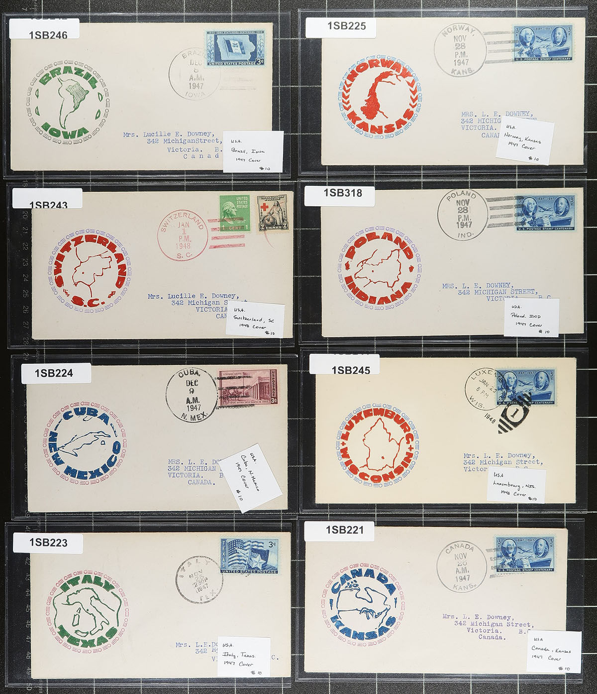 Lovely group of 54 United States covers and cards, 1910's-1940's, containing first day covers, special events, and illustrated advertising covers. We note many many colourful cachets for most covers, along with a few having labels, with every cover sleeved and having retail pricing, most ranging from $10 to $20 each (total retail as marked is $792.00). A lovely lot for collectors and a ready made lot for dealers and online sellers. Estimate =