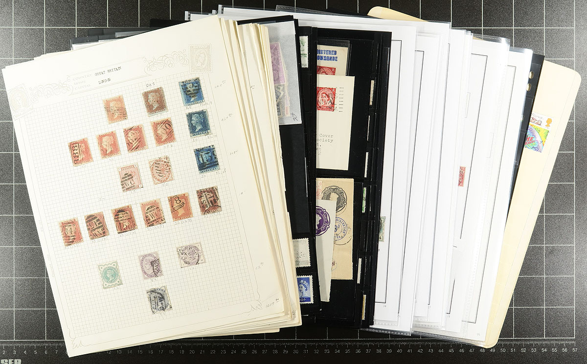 Collection remainders of mint and used Great Britain, Queen Victoria to the 1980's, containing many hundreds of stamps in several stock or album pages. This lot has a little bit of everything, including roughly 70 used Victorian issues (saw a small attempt plating Penny Reds), QEII Castle issues (from various years), mint and used singles, blocks, along with private perfins, officials, postage dues, and more, leaving potential better finds to the dedicated collector. A fun lot for the Great Britain enthusiast. Estimate =