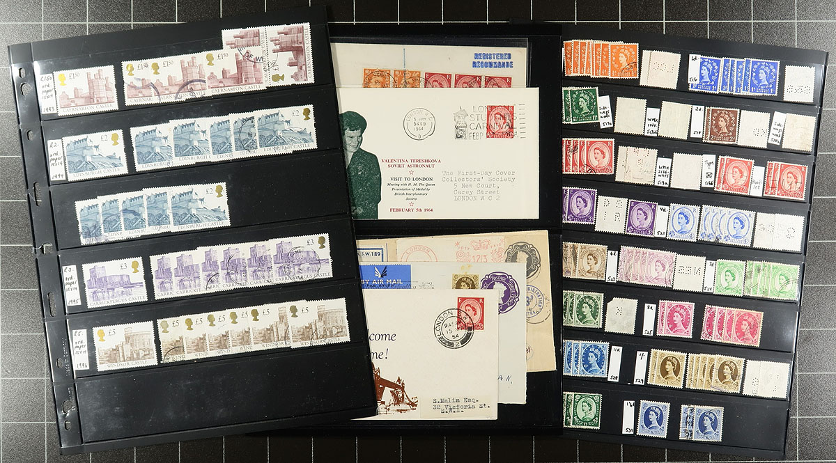 Collection remainders of mint and used Great Britain, Queen Victoria to the 1980's, containing many hundreds of stamps in several stock or album pages. This lot has a little bit of everything, including roughly 70 used Victorian issues (saw a small attempt plating Penny Reds), QEII Castle issues (from various years), mint and used singles, blocks, along with private perfins, officials, postage dues, and more, leaving potential better finds to the dedicated collector. A fun lot for the Great Britain enthusiast. Estimate =