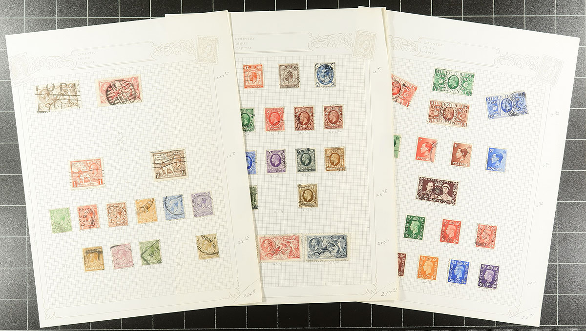 Collection remainders of mint and used Great Britain, Queen Victoria to the 1980's, containing many hundreds of stamps in several stock or album pages. This lot has a little bit of everything, including roughly 70 used Victorian issues (saw a small attempt plating Penny Reds), QEII Castle issues (from various years), mint and used singles, blocks, along with private perfins, officials, postage dues, and more, leaving potential better finds to the dedicated collector. A fun lot for the Great Britain enthusiast. Estimate =