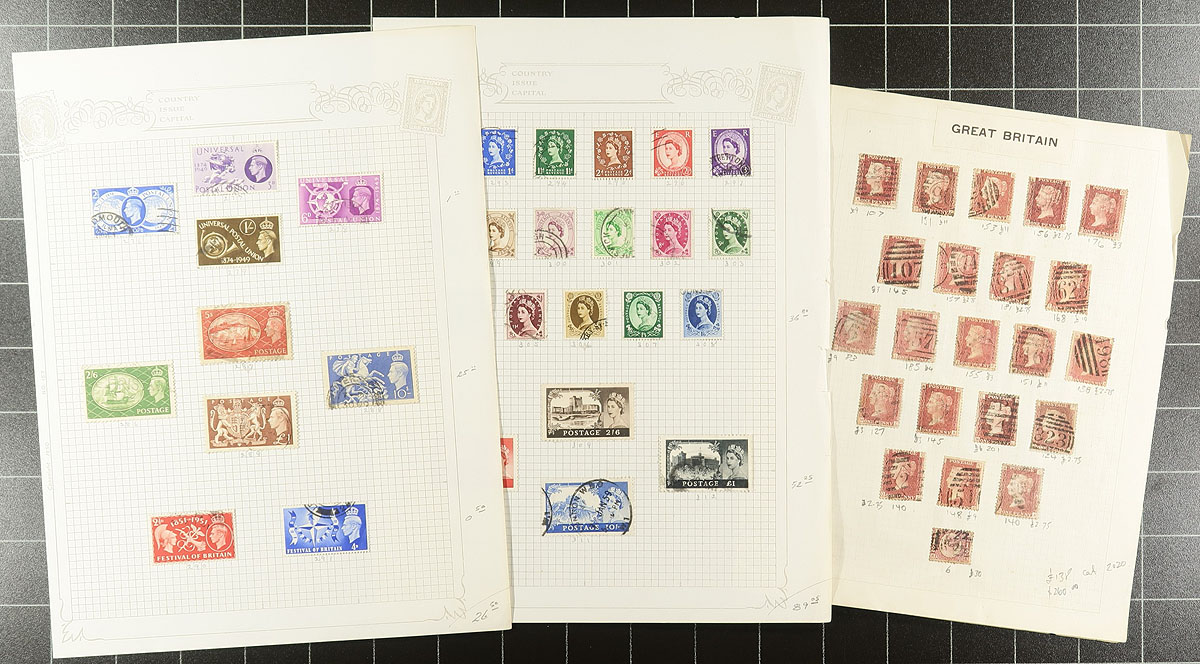 Collection remainders of mint and used Great Britain, Queen Victoria to the 1980's, containing many hundreds of stamps in several stock or album pages. This lot has a little bit of everything, including roughly 70 used Victorian issues (saw a small attempt plating Penny Reds), QEII Castle issues (from various years), mint and used singles, blocks, along with private perfins, officials, postage dues, and more, leaving potential better finds to the dedicated collector. A fun lot for the Great Britain enthusiast. Estimate =