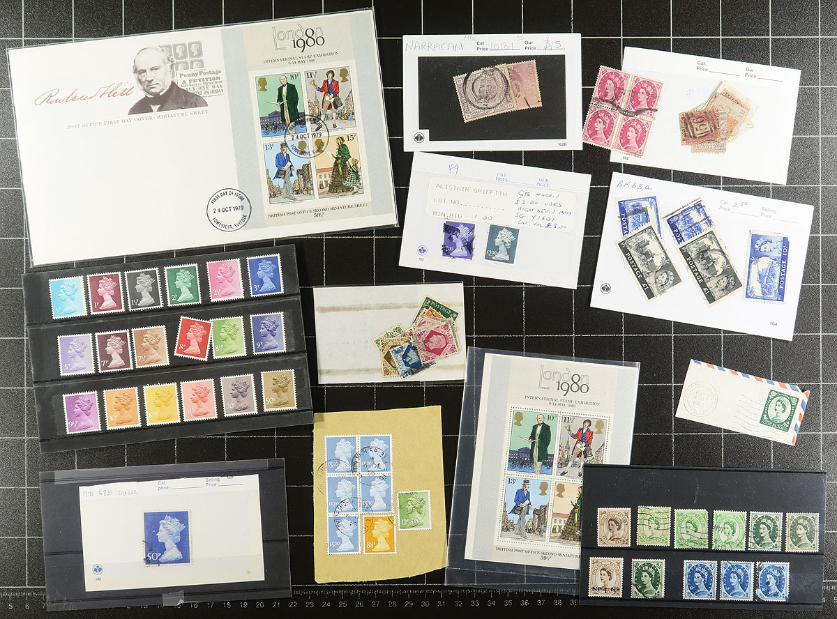 Collection remainders of mint and used Great Britain, Queen Victoria to the 1980's, containing many hundreds of stamps in several stock or album pages. This lot has a little bit of everything, including roughly 70 used Victorian issues (saw a small attempt plating Penny Reds), QEII Castle issues (from various years), mint and used singles, blocks, along with private perfins, officials, postage dues, and more, leaving potential better finds to the dedicated collector. A fun lot for the Great Britain enthusiast. Estimate =
