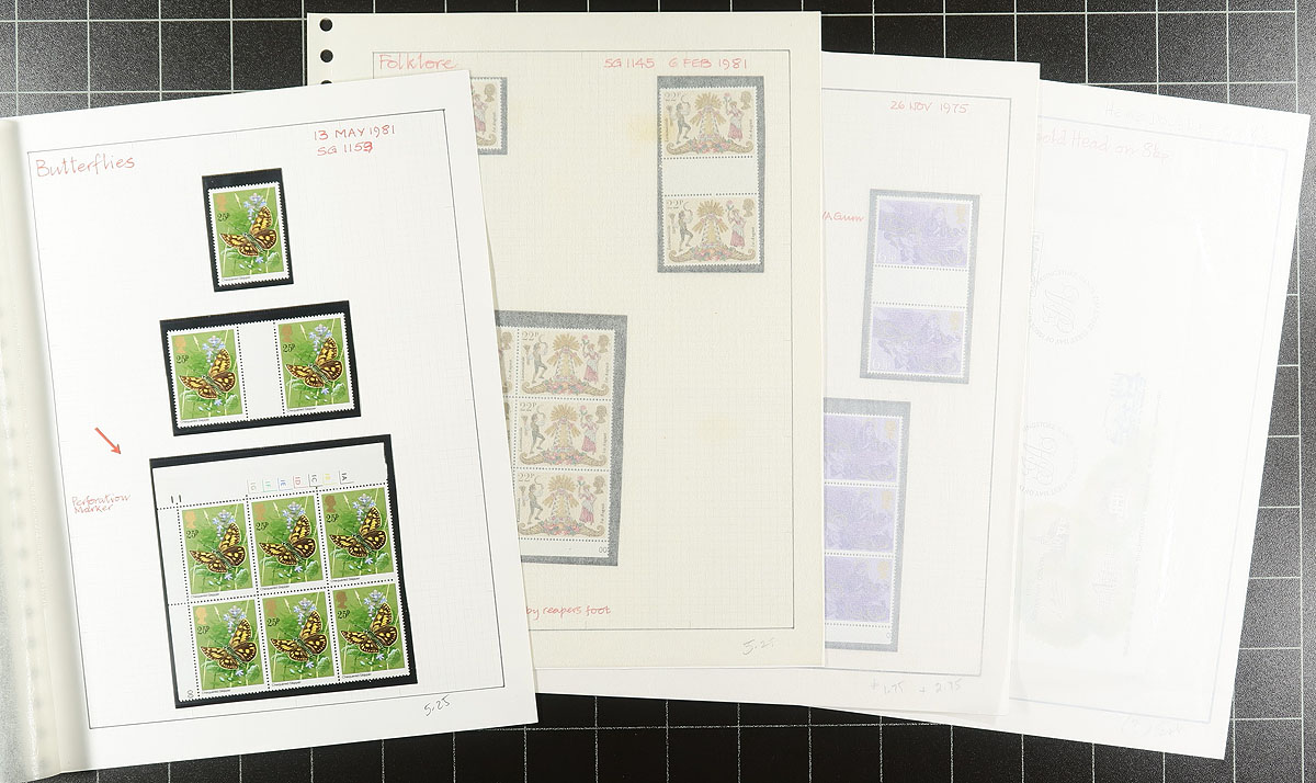 Collection of mint Great Britain printing varieties, 1976-1989, containing many hundreds of stamps in over 80 quadrille pages. This neatly organized collection contains singles, blocks (including cylinder blocks), multiples, and gutter pairs, mostly identifying Stanley Gibbons listed varieties, noting print shifts, flyspecs, plate flaws, paper and gum varieties, etc. A probable good cataloguing lot, which would have been a significant purchase when new, making this a nice companion collection for Great Britain enthusiasts, or for variety collectors. Estimate =