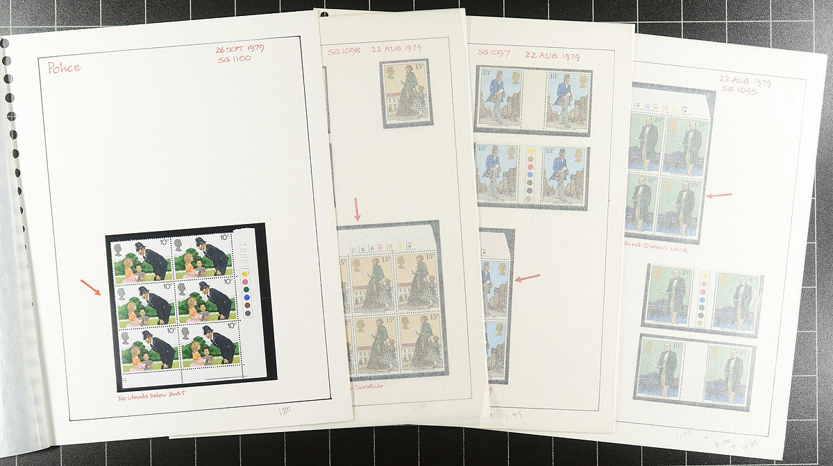 Collection of mint Great Britain printing varieties, 1976-1989, containing many hundreds of stamps in over 80 quadrille pages. This neatly organized collection contains singles, blocks (including cylinder blocks), multiples, and gutter pairs, mostly identifying Stanley Gibbons listed varieties, noting print shifts, flyspecs, plate flaws, paper and gum varieties, etc. A probable good cataloguing lot, which would have been a significant purchase when new, making this a nice companion collection for Great Britain enthusiasts, or for variety collectors. Estimate =