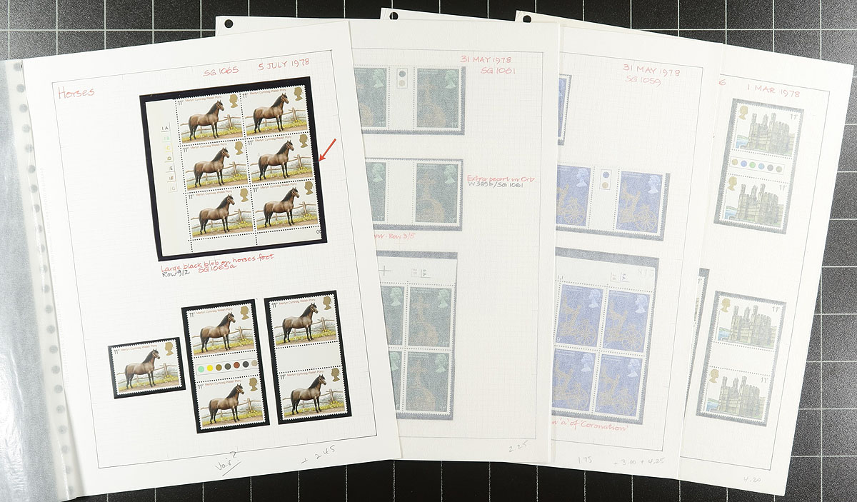 Collection of mint Great Britain printing varieties, 1976-1989, containing many hundreds of stamps in over 80 quadrille pages. This neatly organized collection contains singles, blocks (including cylinder blocks), multiples, and gutter pairs, mostly identifying Stanley Gibbons listed varieties, noting print shifts, flyspecs, plate flaws, paper and gum varieties, etc. A probable good cataloguing lot, which would have been a significant purchase when new, making this a nice companion collection for Great Britain enthusiasts, or for variety collectors. Estimate =