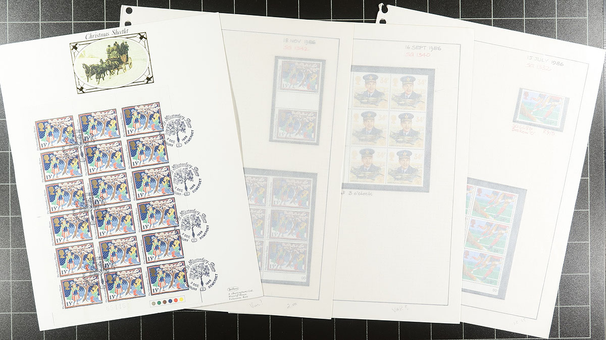 Collection of mint Great Britain printing varieties, 1976-1989, containing many hundreds of stamps in over 80 quadrille pages. This neatly organized collection contains singles, blocks (including cylinder blocks), multiples, and gutter pairs, mostly identifying Stanley Gibbons listed varieties, noting print shifts, flyspecs, plate flaws, paper and gum varieties, etc. A probable good cataloguing lot, which would have been a significant purchase when new, making this a nice companion collection for Great Britain enthusiasts, or for variety collectors. Estimate =