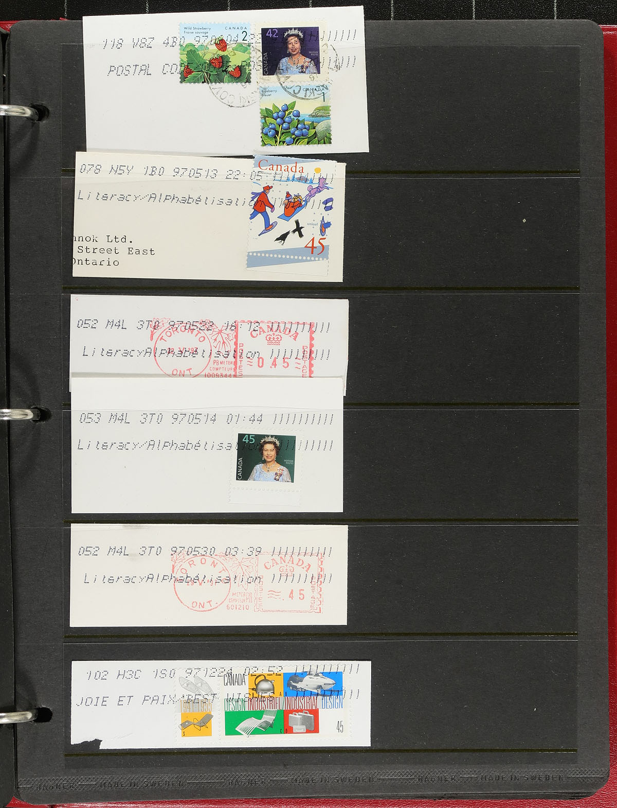 Accumulation of many hundreds of covers and cards, 1920's-2000's. A cursory check indicated representation from across the country noting a wide variety of items including a collection (set) of Maniwaki PQ black and white picture postcards, an album with over 50 covers with pictorial cancels from 2014, two binders with hundreds of spray-on cancels, along with hundreds of loose covers. We spotted a wide variety of town postmark types including cds, split ring, Klussendorf, POCON types and more, along with a variety of rates and frankings. A nice project for the Canada cover collector, a few faults with a few of the covers, overall fine to very fine. Estimate =