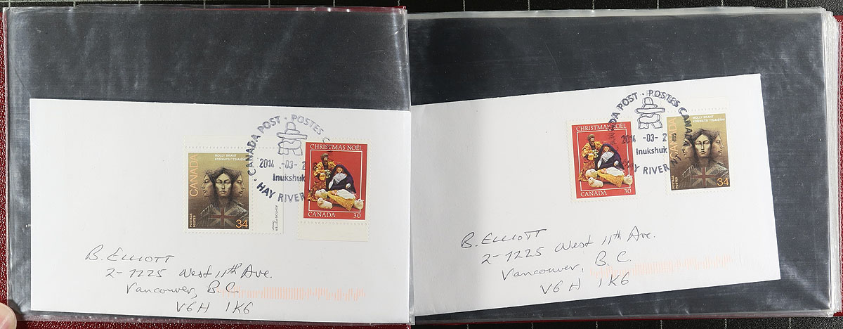 Accumulation of many hundreds of covers and cards, 1920's-2000's. A cursory check indicated representation from across the country noting a wide variety of items including a collection (set) of Maniwaki PQ black and white picture postcards, an album with over 50 covers with pictorial cancels from 2014, two binders with hundreds of spray-on cancels, along with hundreds of loose covers. We spotted a wide variety of town postmark types including cds, split ring, Klussendorf, POCON types and more, along with a variety of rates and frankings. A nice project for the Canada cover collector, a few faults with a few of the covers, overall fine to very fine. Estimate =