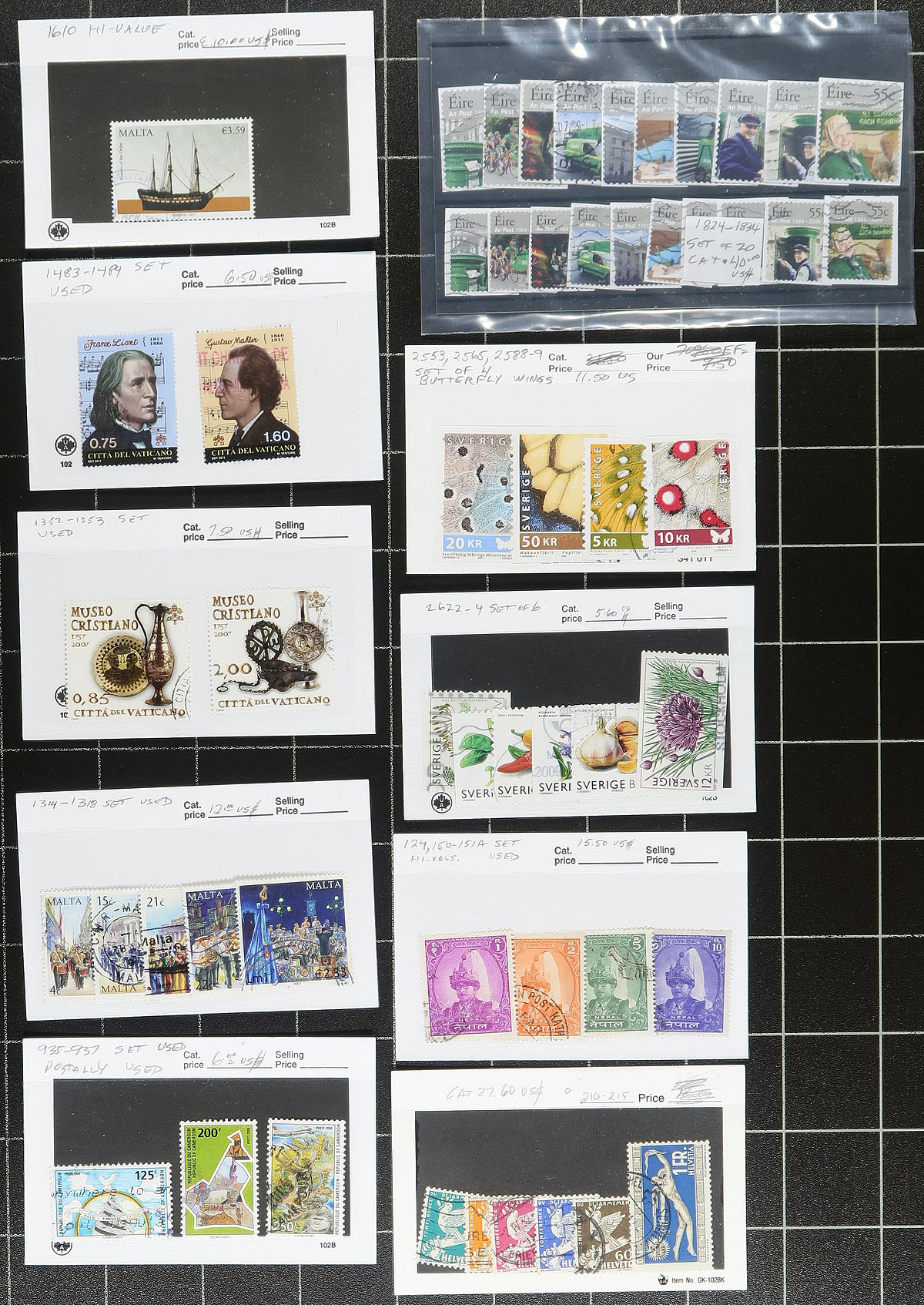 Selection of 72 different BETTER used sets & high values on dealer stock cards, 1930's to recent, all catalogue US$5.00 & up in Scott. Note Germany B338-B341, Ireland #1824-1834, Kuwait #762-763, New Zealand AR102 - AR105, Singapore #580-583, Sudan C4-C15, Sweden #248-262, Sweden #2327-2336 and Vatican #1427-1429 etc. Desirable material & great dealer stock! Be sure to look at the scans. 2025 Scott US1,184.00 =