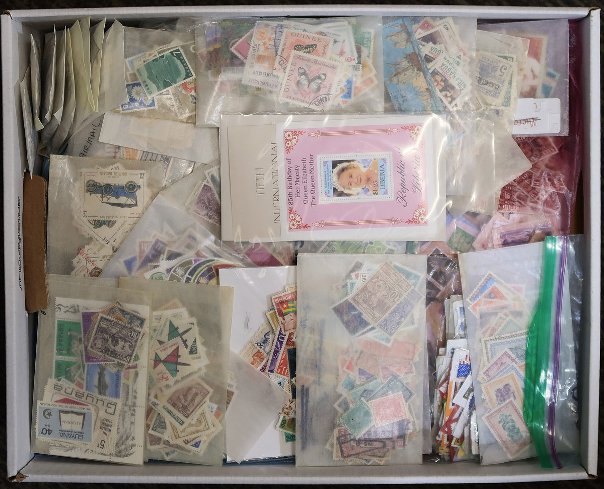 Banker's box (about 20 lbs.) crammed tightly with loose stamps, baggies, glassines, and an old stockbook. On and off paper. Includes some Canada. Noted some better stamps in the stockbook, rest of box as received. Estimate =