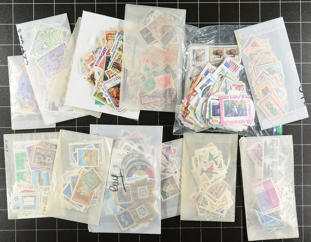Banker's box (about 20 lbs.) crammed tightly with loose stamps, baggies, glassines, and an old stockbook. On and off paper. Includes some Canada. Noted some better stamps in the stockbook, rest of box as received. Estimate =